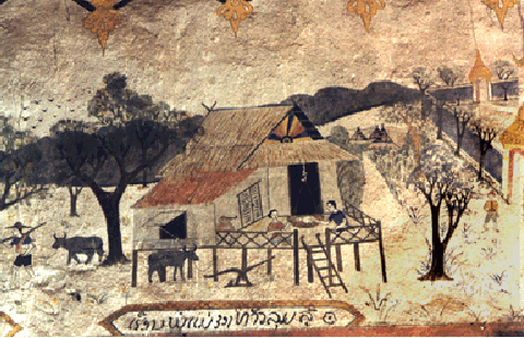 of Phra Lak-Phra Lam: "Once a Brahma (God) and his wife came down from Heaven to Earth, and because they tasted the flavour of the soil through curiousity, they lost their supernatural powers and were unable to return to their celestial dwelling. They resigned themselves to a stay on Earth and built a kingdom named Muong Inthapatha Maha Nakhone. They had a son, named Thaporamasouane. After the death of his father, the Brahma, Thaporamasouane was crowned king. But he shortly ceded the throne to his second son, Thao Viloun Ha. This disappointed his elder son, Thao Thattaradtha, so much that he left the country, went to the north, and settled at Phan Phao, a place on the right bank of the Mekong, where he built a city called Maha Thani Si Phan Phao." |