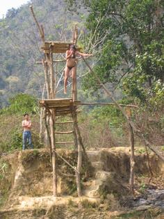 We stopped at a waterhole to jump off a rickety bamboo platform that was much scarier than the actual leap. I found watching Tess jump more enjoyable, anyhow. All around the river the vegetation was lush: bright green algae, water morning glory lilies graced the river, while a myriad of ferns, colorful blossoms and spiny plants lay along the shore. Yul Gibbons would have enjoyed this fertile land.