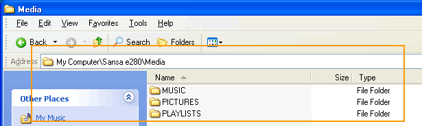 Step 5: Double click on Sansa e280 drive, the default two folders appear as seen in the image below.
